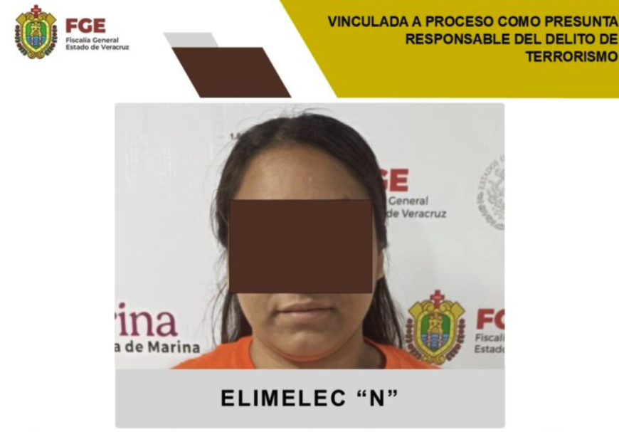 La Fiscalía Regional de Coatzacoalcos obtuvo la vinculación a proceso de Elimelec “N”, señalada como presunta responsable del delito de terrorismo. Los hechos ocurrieron el 19 de septiembre, cuando habría participado en la colocación de una narcomanta en el portón de una primaria ubicada en la colonia Puerto México.