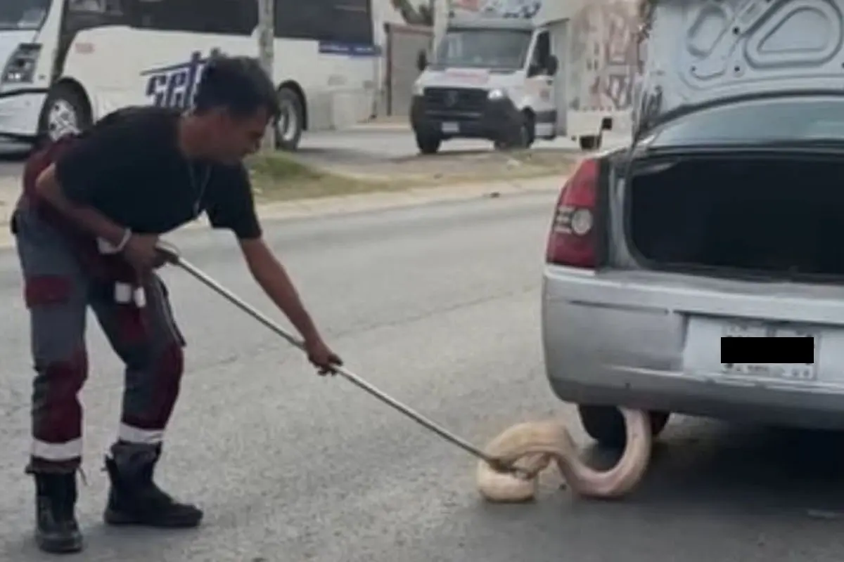 Zuazua, Nuevo León.- Una conductora vivió un momento de sorpresa y alarma este lunes, cuando fue advertida por un transeúnte de que una pitón de más de dos metros asomaba desde la defensa trasera de su automóvil mientras circulaba por la avenida Real de Palmas, en la colonia del mismo nombre.