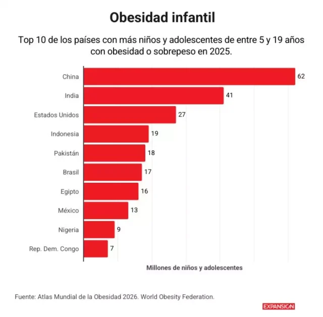 México pasó del primer lugar mundial al octavo en obesidad infantil, de acuerdo con el Atlas Mundial de la Obesidad 2026. Aunque hace 15 años el país se ubicaba entre las primeras dos posiciones a nivel global, actualmente registra alrededor de 13 millones de casos entre niños y adolescentes, siendo superado por países como China, India, Estados Unidos, Indonesia, Pakistán, Brasil y Egipto.