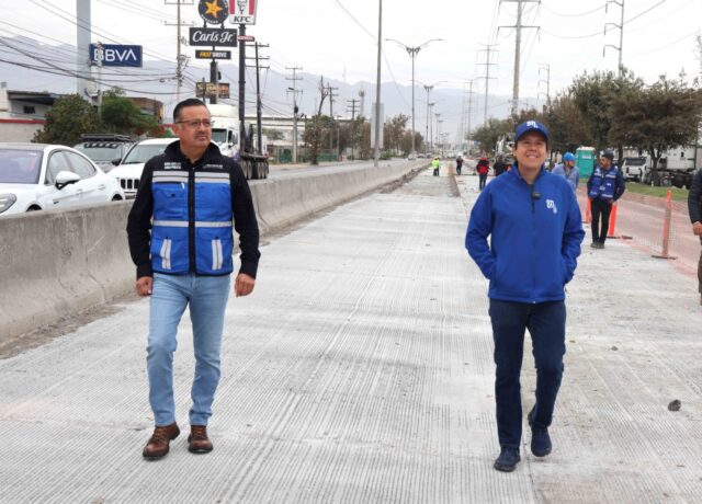 El edil subrayó los trabajos en la avenida López Mateos, donde se instala pavimento de concreto hidráulico con un avance del 60%, obra que fortalecerá la seguridad y agilidad del tránsito, además de consolidar un corredor vial que conecta a Monterrey y Apodaca. Señaló que esta vialidad se encuentra en su etapa final de construcción.