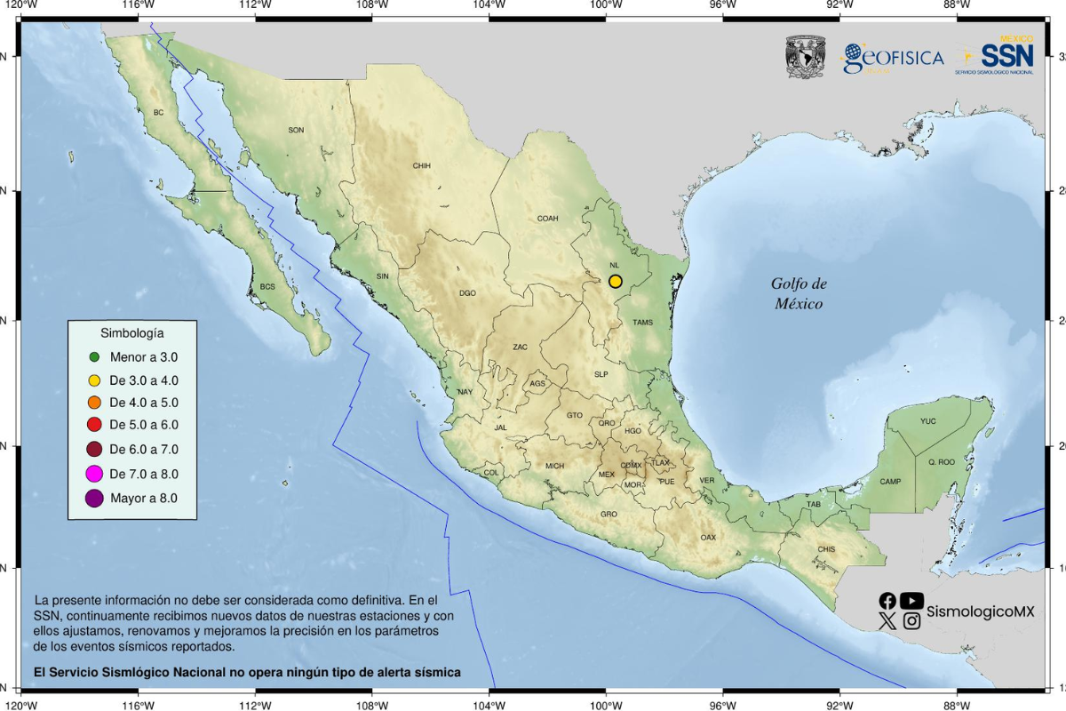 Un sismo de magnitud 3.4 se registró la noche del jueves con epicentro a 15 kilómetros al este de Montemorelos, en la región citrícola de Nuevo León. El movimiento, ocurrido a las 19:51 horas y con profundidad de solo 5 kilómetros, fue perceptible en varios municipios, aunque las autoridades confirmaron que no hubo lesionados ni daños materiales.