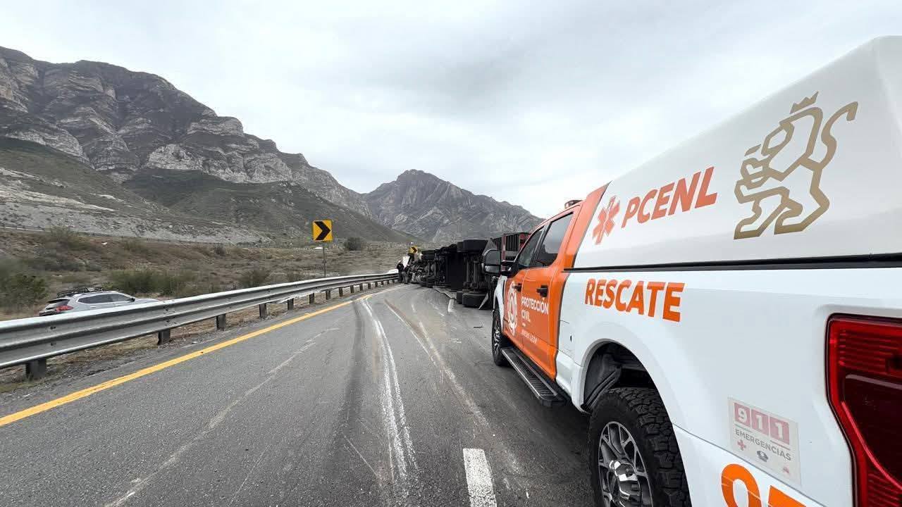 Un tráiler con caja cerrada volcó este sábado en una curva de la Carretera Libre Monterrey-Saltillo, bloqueando completamente los dos carriles de circulación hacia Saltillo. El accidente ocurrió aproximadamente a las 14:30 horas en el kilómetro 50, en un tramo conocido como Sesteo de las Aves.
