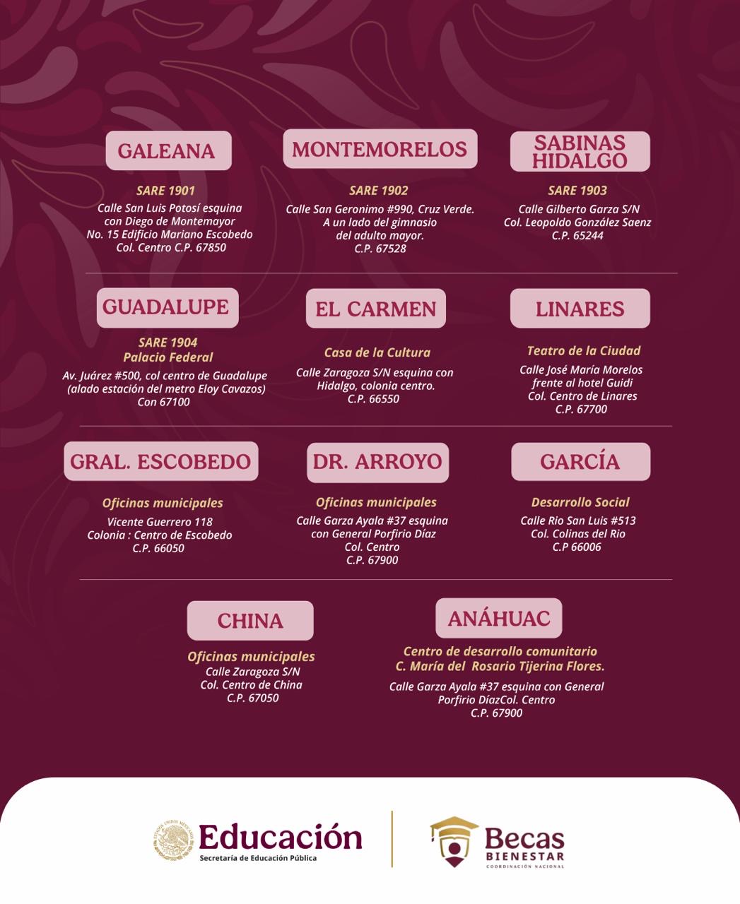 Por su parte, el coordinador estatal de Becas para el Bienestar en la entidad, Esteban Nevares, señaló que se han habilitado once oficinas en Nuevo León para brindar apoyo a quienes deseen realizar el trámite de manera presencial. Asimismo, indicó que el registro también puede efectuarse en línea a través del sitio oficial del programa que es: https://buscador.becasbenitojuarez.gob.mx/sedes-atencion/