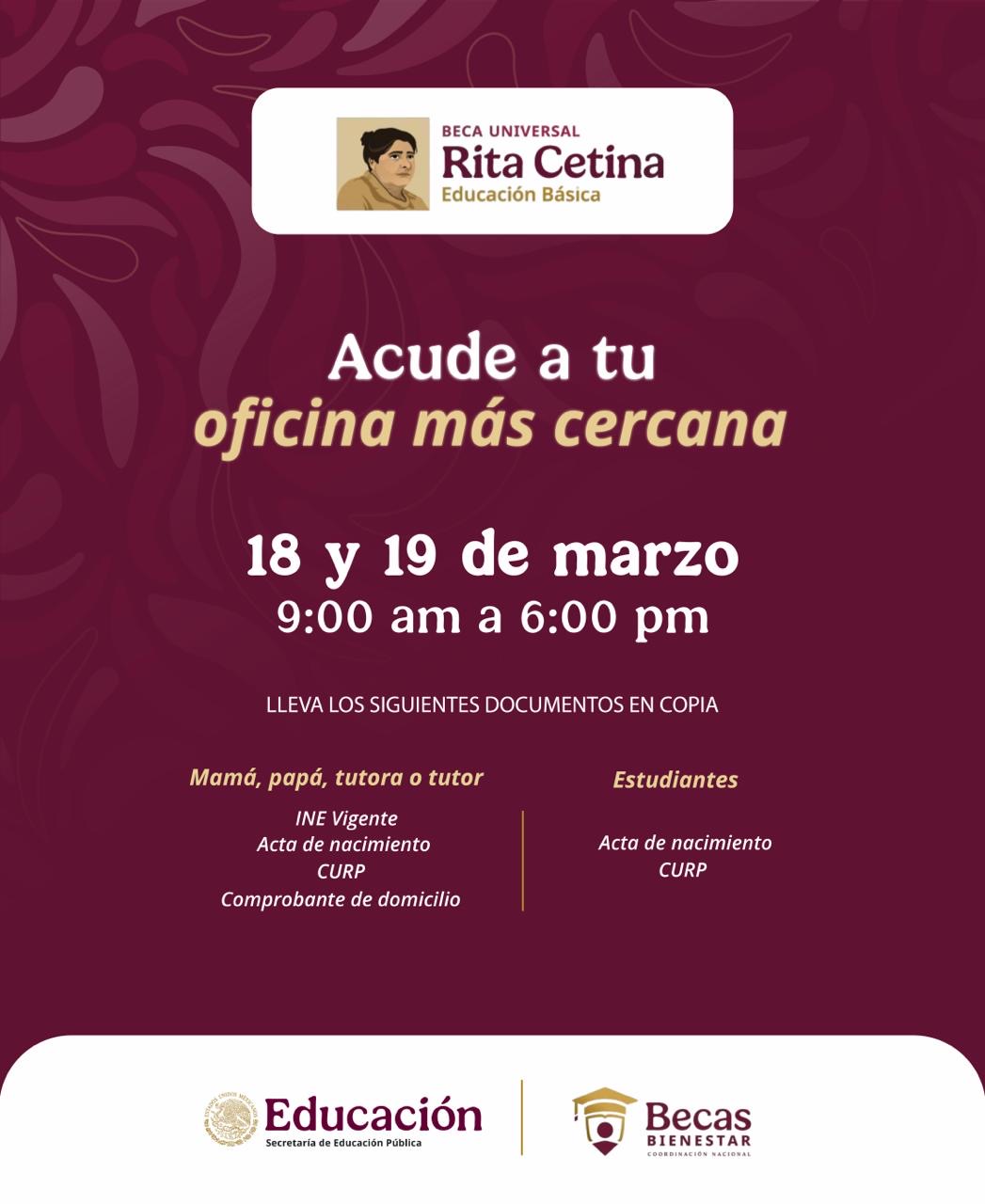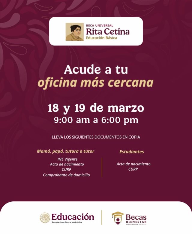 Autoridades federales recordaron que el próximo 19 de marzo será el último día para que padres de familia realicen el registro de sus hijos a la beca “Rita Cetina”, dirigida a estudiantes de nivel primaria.